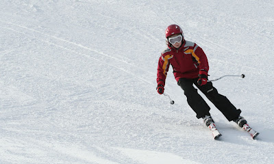 As for Olivia, it's very interesting to see her skiing develop. We have skied together for nearly four winters now, but in the last twelve months she has spent some extra time skiing with the Kandahar Ski Club. This race training has clearly developed her skiing, not only gaining extra speed but enhancing control. Have a look at her carving technique above, and the clean tracks left behind in the snow.
