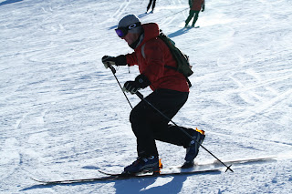 Each turn requires the telemarker to bend down on one knee!?! It's like doing constant lunges all day long. Rick is an expert alpine skier, so for him to go back to learning sliding again from scratch was a shock and a challenge. However, he has picked up the skills and knowledge really well and has pledged to continue practising in the future after his muscle aches have disappeared!