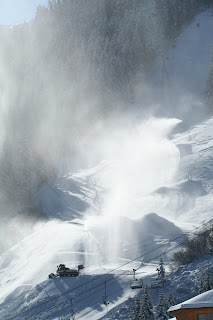 Hello everybody from a very chilly but white Meribel. It's soooo good being back in the mountains again, especially seeing all the fresh snow. The temperatures are very low, so there are also huge piles of artificial snow now being created, squashed and groomed by the piste bashers.The conditions are better than normal, which means that the opening date of the resort has been brought forward a week to this weekend, fantastic! However, because I am so impatient to get on my skis, I went to Val d'Isere yesterday for my first few wobbley turns. My feet objected to being introduced to their 'home' for the next five months though, ie ski boots. Snow conditions were great, but the weather was challenging with poor visibility. But quite honestly I didn't care, I was skiing again, it's that simple.