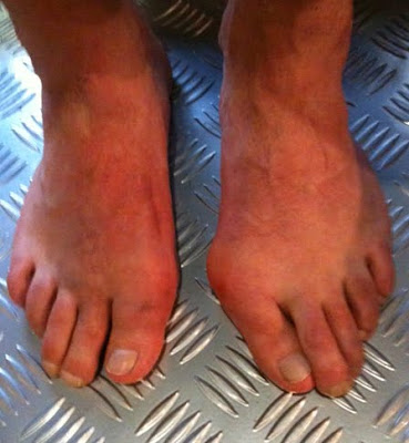 Oh dear, I don't think he's looking at his best right now, something to do with toffee vodkas. We'll go back to a photo of him a little later. Graham first put skis on last August, in Chile of all places. He had three days as a complete beginner over there, and I took over to help him progress on and beyond the green pistes. However, he had a major problem, incredible pain in his ski boots. It stems back to a few problems in his youth, plus breaking his foot when running to a meeting in London. Instead of jumping up to mount the pavement he instead swiftly whacked the kerb with full force, hence the broken foot. Cue wincing from all readers. Two operations later and his feet now look like this.....