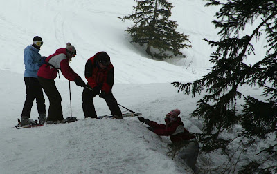 Where the hell was Rachel? I couldn't see any evidence, no movement, nothing, just debris of ski equipment. However, after 20 seconds or so a large tree trunk swayed, and then Rachel's head popped up, plus further giggles. Joe and Alex got down on their stomachs to reach for Rachel. I reached down as well, but into my bag for my camera sensing a couple of cheeky shots for the blog.