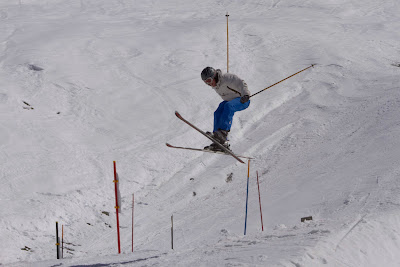 I've heard a rumour that the Folie Douce franchise may well spread into the Méribel valley soon, located at the Choucas restaurant close to the mid-station of the Burgin Saulire bubble. One of the many things I love about my job is being with people on their precious holiday. The relaxed, playful, happy and many other emotions are all very infectious. However, I also occasionally come across another mental state, competitiveness. This appeared on our final ski back down to Méribel, when the two Nicks wanted to go into the 'Fun Park' to do some jumps. There were two jumps close to each other, which were later discussed and judged down in Méribel during apres ski over a beer. So here goes with Nick T's first jump.