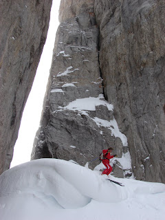 The route began with a couple of lifts, then it was on with the skins attached to the bottom of our skis for the slog. We had over three hours of skinning uphill, and close to another hour booting up with skis on shoulders. It was knackering. We stopped close to the top for a picnic of bread, ham and local beaufort cheese followed by some of Ian's hearty strong sweet coffee. All of this with an amazing view, miles away from humans and surrounded by virgin powder.It was tough to leave this secret spot, but some powder skiing was between us and the safety of Pralognan, all 1,000 metres vertical drop of it. The first 20 minutes were spent playing down a very narrow steep couloir which eventually fanned out to a massive open expanse. Oh, my goodness, powder skiing at its best. We took it in turns leaving our squiggles, firstly for safety reasons, but also to extend the enjoyment by watching each other with massive grins on our faces.