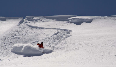 The glacier is vast, but constantly moving. It changes character every year, in other words, we couldn't rely on memory of where the dangerous deep crevasses were. Ian and I noticed several interesting changes since our previous tour last spring. However, we were still able to select pitch after pitch of clean virgin snow.